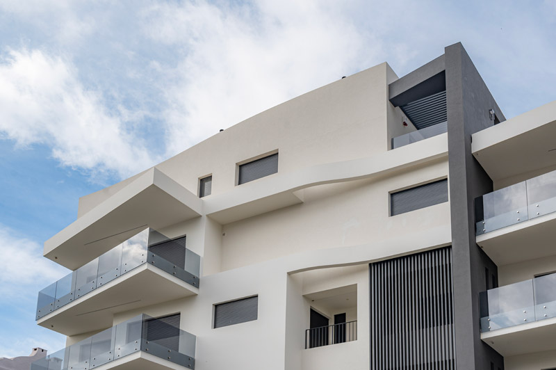 Εφαρμογή συστήματος εξωτερικής θερμομόνωσης σε νέο κτίριο με τελικό ακρυλικό επίχρισμα.